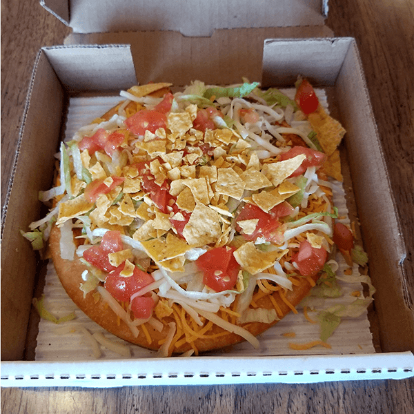 Our Pan Crust, With Our Homemade Mexican Meat Sauce, Hot Or Mild Sauce, Onions, Lettuce, Cheese And Tortilla Chips.