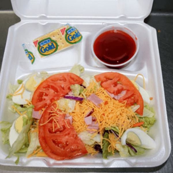 Iceberg Lettuce With Ample Amounts Of Ham And Cheddar Cheese, Then Topped With Tomatoes And A Hard Boiled Egg. Served With Club Crackers And Your Choice Of Dressing.